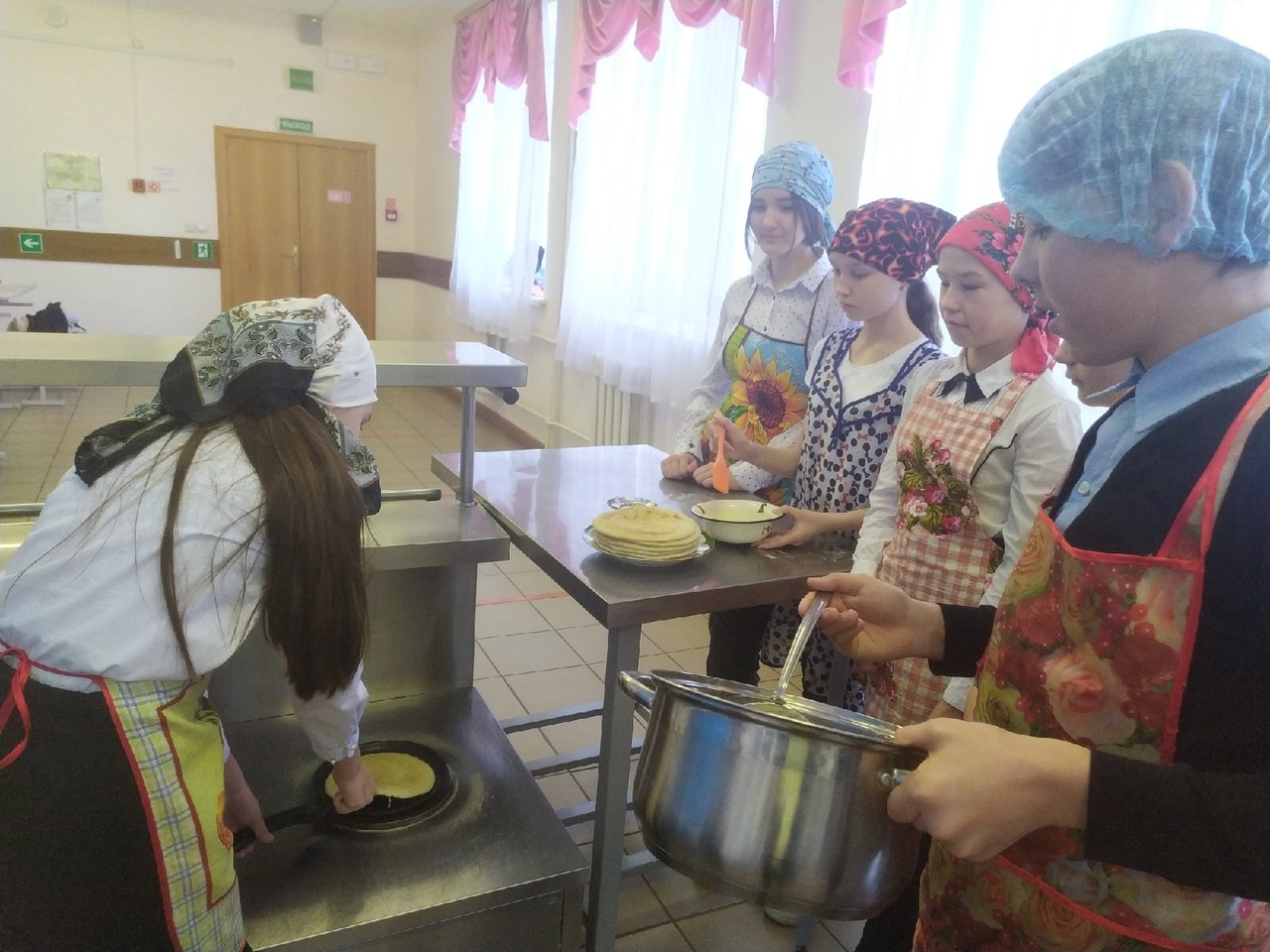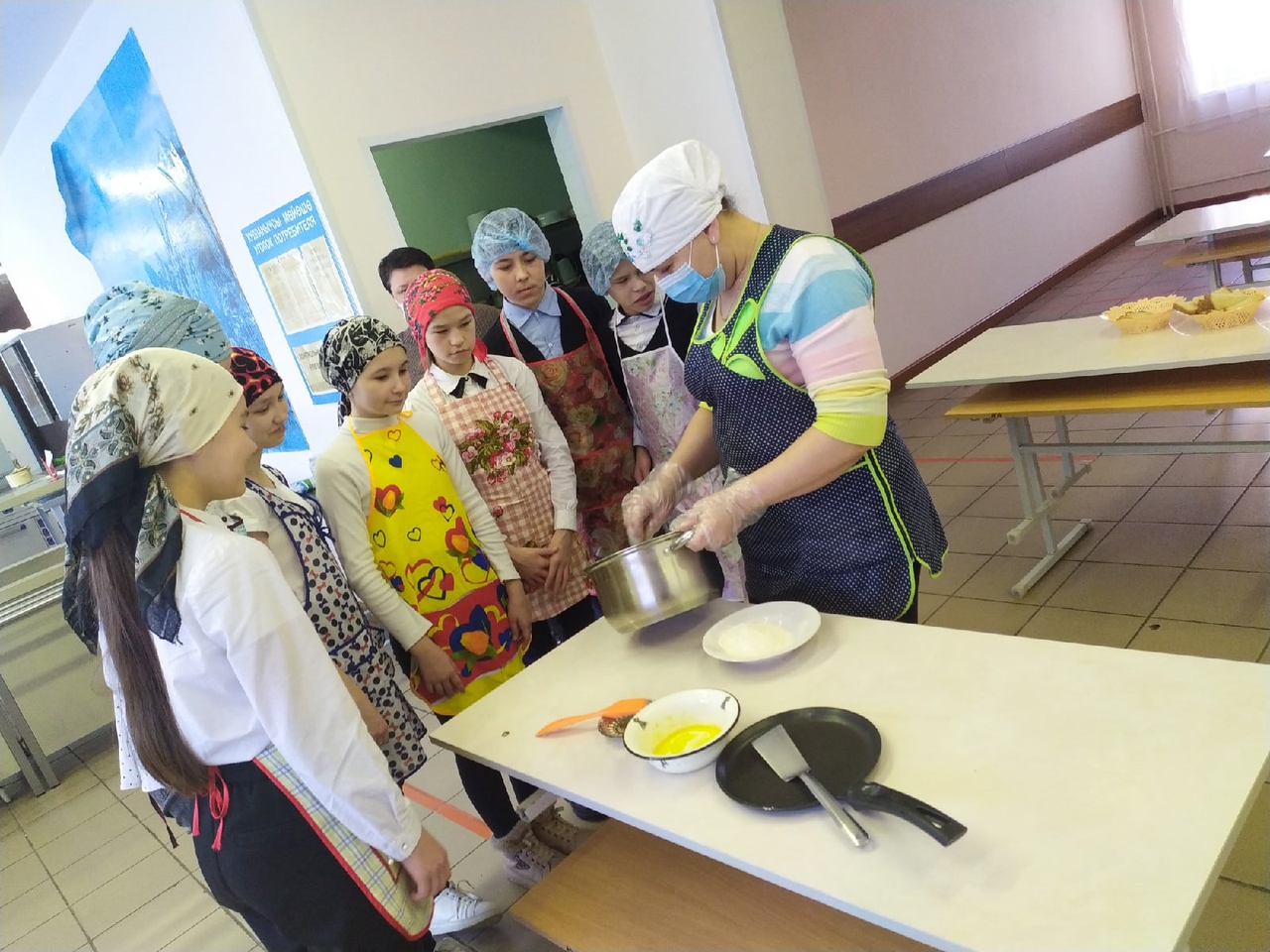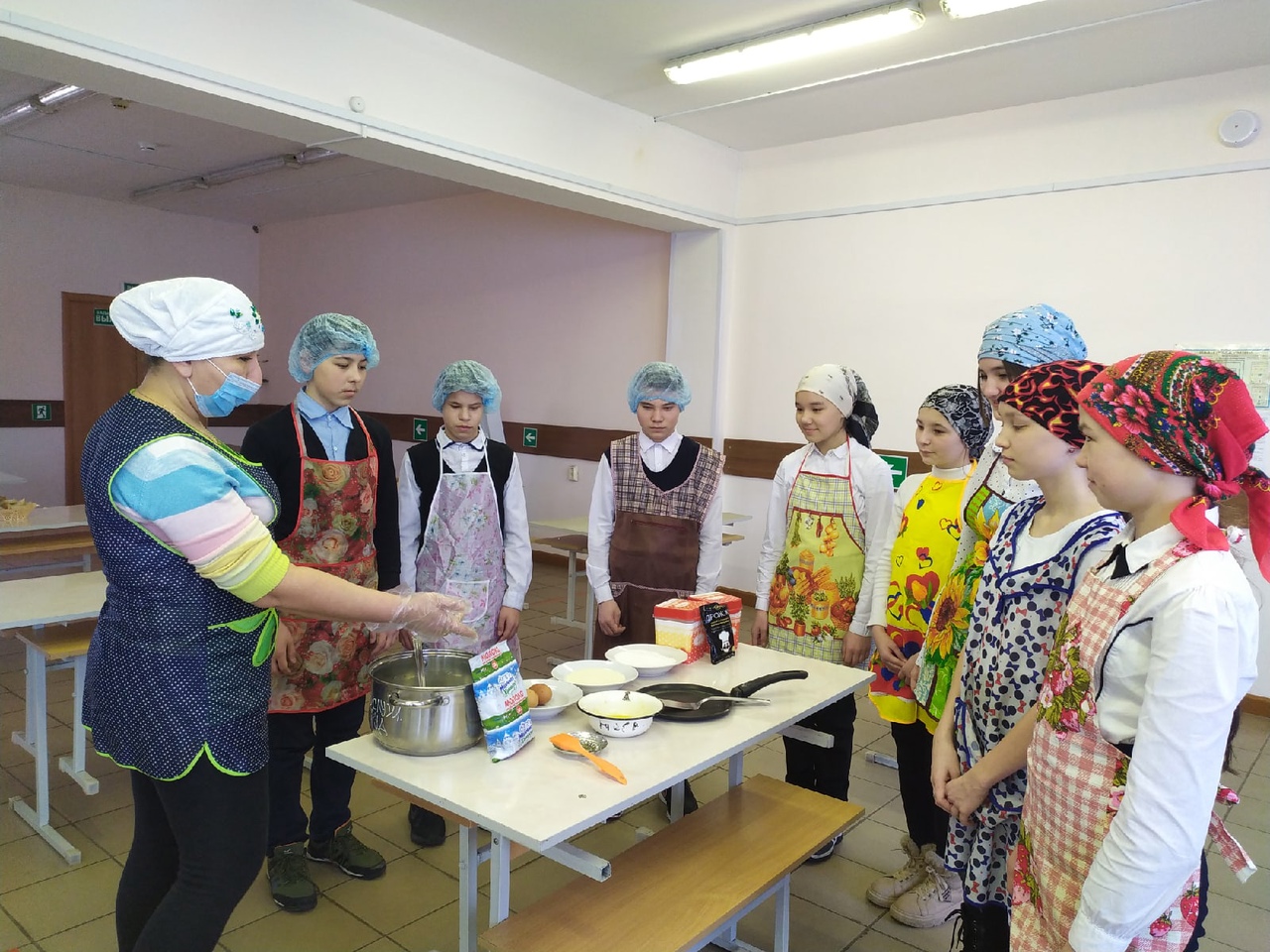 Учащиеся 7 класса вместе с поваром Нуртдиновой Ф.А. и учителем технологии Гильмутдиновой Р.Г. приготовили одно из национальных блюд народа, проживающего на территории нашего района «Тәекмәк( тәбикмәк)”.