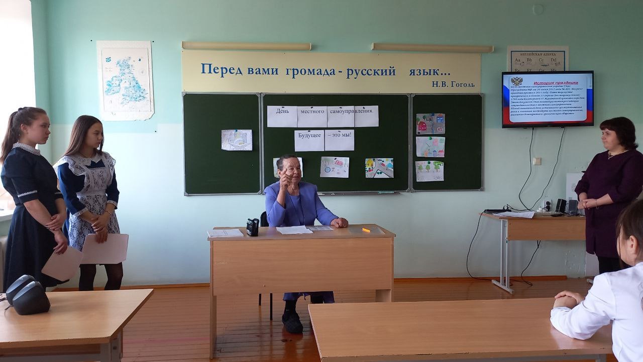 В целях развития гражданского общества, укрепления принципов демократии и популяризации института местного самоуправления в школе для учащихся прошёл открытый урок, посвящённый Дню местного самоуправления, на котором присутствовала ветеран муниципальной службы Гарейшина Фания Гаделовна.